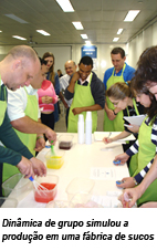 Dinâmica - A parte prática do treinamento foi feita por meio de duas "fábricas" concorrentes de sucos: a verde e a laranja. Cada equipe recebeu aventais coloridos e vários equipamentos simples, como potes, copos, misturadores, dosadores, água, pós para diluição e bandejas.