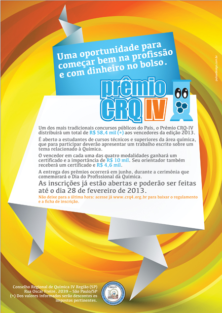 A imagem ao lado (clique nela para ampliá-la) é uma reprodução do cartaz elaborado pelo Conselho para reforçar a divulgação da edição 2013 do Prêmio CRQ-IV. Durante o mês de novembro, exemplares foram enviados a todas as instituições paulistas de ensino que ministram cursos técnicos e superiores na área química. As escolas que eventualmente não tenham recebido o cartaz ou precisarem de mais exemplares poderão solicitá-los pelo e-mail diretoria@crq4.org.br.