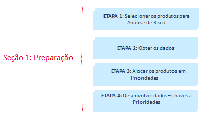 Essa ferramenta está dividida em duas seções principais, cada uma delas compreendendo quatro etapas individuais como demonstrado na figura 2. A primeira seção é a da “preparação”, a qual mostra o passo-a-passo para obter as informações necessárias à análise de risco. A segunda seção é a da “implementação”, a qual executa a análise de risco propriamente dita. A conclusão de cada etapa é um preparativo para a próxima, portanto é importante ater-se a cada uma delas na sequência correta.