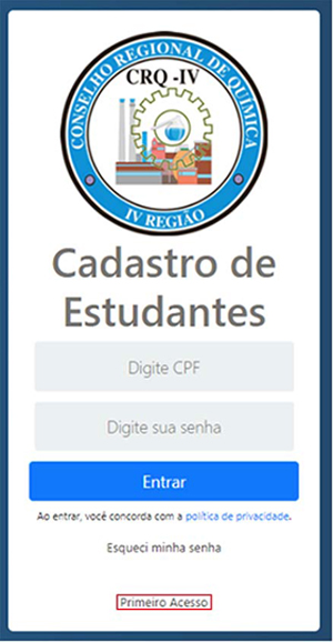 O cadastro de estudantes é feito com o preenchimento do formulário, cujo acesso se dá pela página www.crq4.org.br/cadastro_estudantes. O passo inicial será criar uma Identidade Digital no site do Conselho. Para isso, basta clicar no botão localizado no final da página, o que fará surgir a imagem ao lado.
