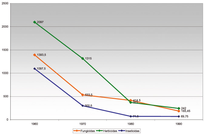 Um levantamento da Andef mostra que, na década de 1960, os agricultores precisavam aplicar, em média, mais de um quilo de inseticida por hectare para combater pragas; na década de 1990, o volume médio aplicado caiu para menos de 70 gramas por hectare, uma redução de 93%. Ao mesmo tempo, os defensivos se tornaram menos tóxicos: de acordo com a Andef, a toxicidade dos inseticidas foi reduzida em cerca de 160 vezes, no período de 1960 a 2000. (Confira o gráfico abaixo).