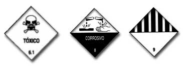 Os rótulos de risco têm a forma de um quadrado, apoiado sobre um de seus vértices, com dimensões mínimas de 100mm por 100mm, com uma linha da mesma cor do símbolo, a 5mm da borda e paralela a seu perímetro. Podem ser usados rótulos menores em embalagens que não comportem os rótulos estipulados, sempre que as exigências específicas permitirem o uso de embalagens com dimensões inferiores a 100mm de lado.