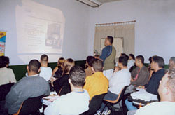 Como parte dos trabalhos de conclusão de curso, os alunos do terceiro semestre de Química estão apresentando palestras aos seus colegas, abordando áreas em que atuaram durante seus estágios. A foto acima registra a apresentação sobre Filtragem de Água/Óleo, feita pelo aluno Leandro G. de Melo. As palestras são coordenadas pelos professores Marcos Sergent, coordenador da área de química, e Valéria Diniz Benites e Robson João Bertocco, coordenadores-gerais do Colégio Meta.