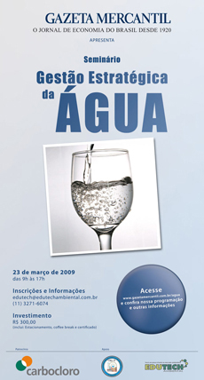 Numa parceria inédita envolvendo o Conselho Regional de Química IV Região (CRQ-IV - São Paulo), a empresa Edutech Ambiental, o jornal Gazeta Mercantil e com o patrocínio da Carbocloro, está programado para 23 de março, no auditório do Conselho, o seminário "Gestão Estratégica da Água". Comemorativo ao Dia Mundial da Água, cuja data oficial é 22 deste mês. O evento pretende reunir especialistas para apresentar temas como o reúso da água na indústria química, oportunidades econômicas da água, abastecimento seguro para o consumo humano e uso sustentável de recursos naturais. Foram convidados representantes dos ministérios do Meio Ambiente e das Cidades, secretarias do governo do estado de São Paulo e dirigentes de empresas e associações empresariais ligadas à questão da água. Clique aqui ou na imagem ao lado para acessar o hot site do evento.